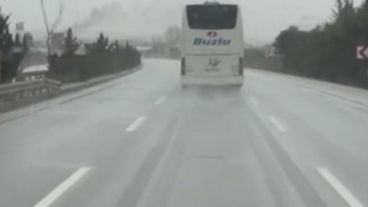 Antalya-Isparta Karayolu'nda geçtiğimiz gün 10 kişinin hayatını kaybettiği otobüs kazasının ardından yine Buzlu firmasına ait bir başka otobüsün yağışlı havada aynı güzergahta hızla ilerlediği anlar cep telefonu kamerasına yansıdı.