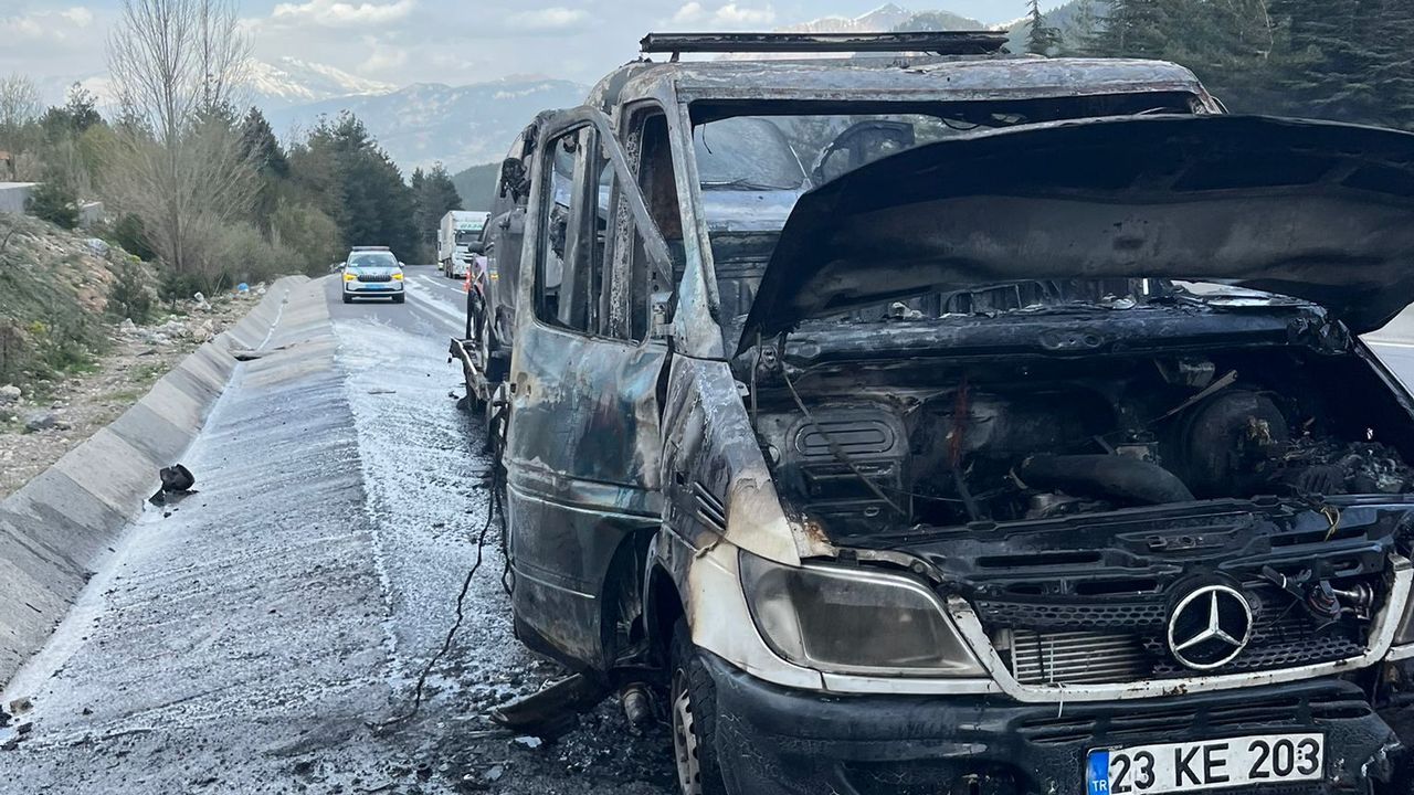 Sürücünün yol kenarına çektiği araçtaki yangın, üzerinde yüklü otomobil ve hafif ticari araca da sıçradı.