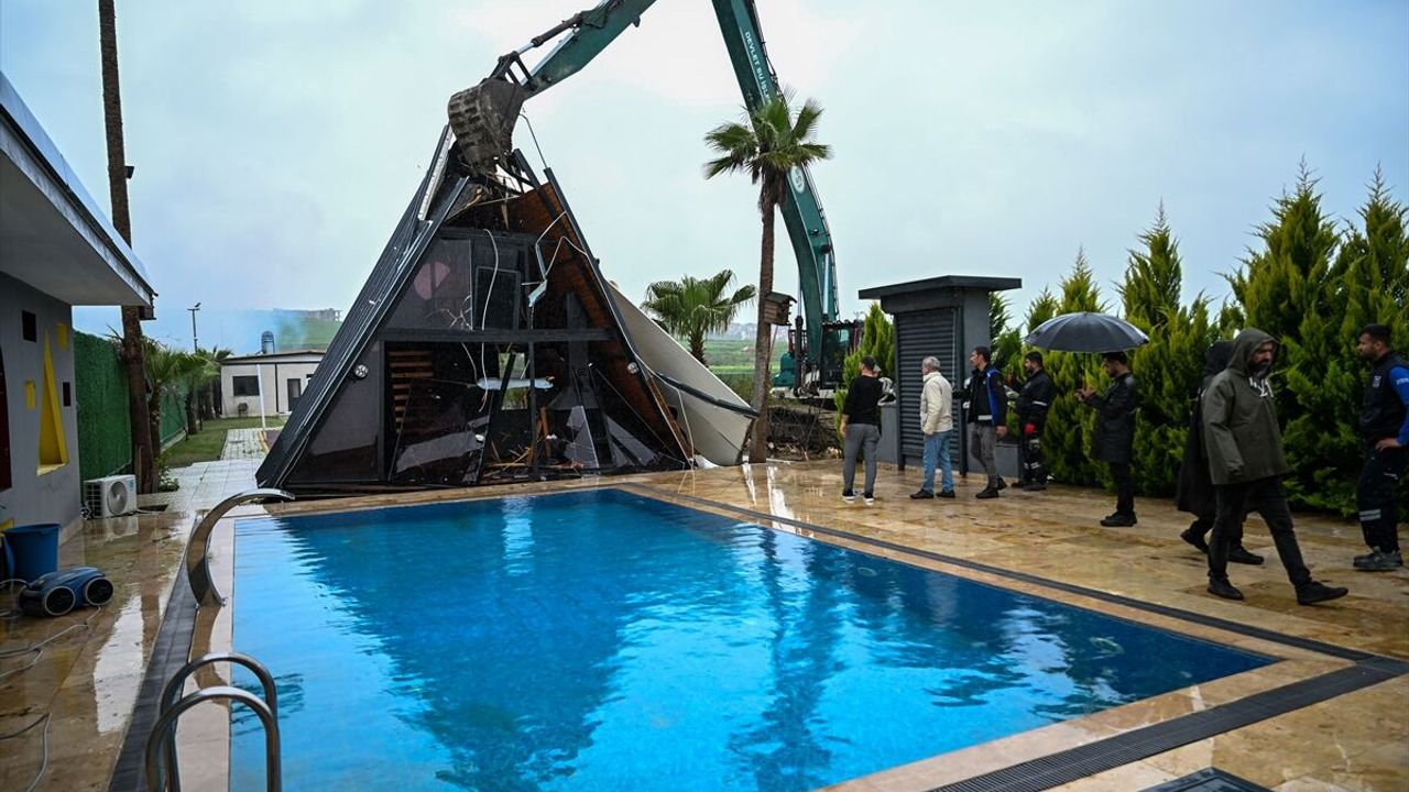 Devlet Su İşleri, Büyükşehir Belediyesi ve Sarıçam Belediyesi ekiplerince iş makineleriyle yıkılan yapıların kalıntıları, kamyonlarla bölgeden uzaklaştırılıyor.