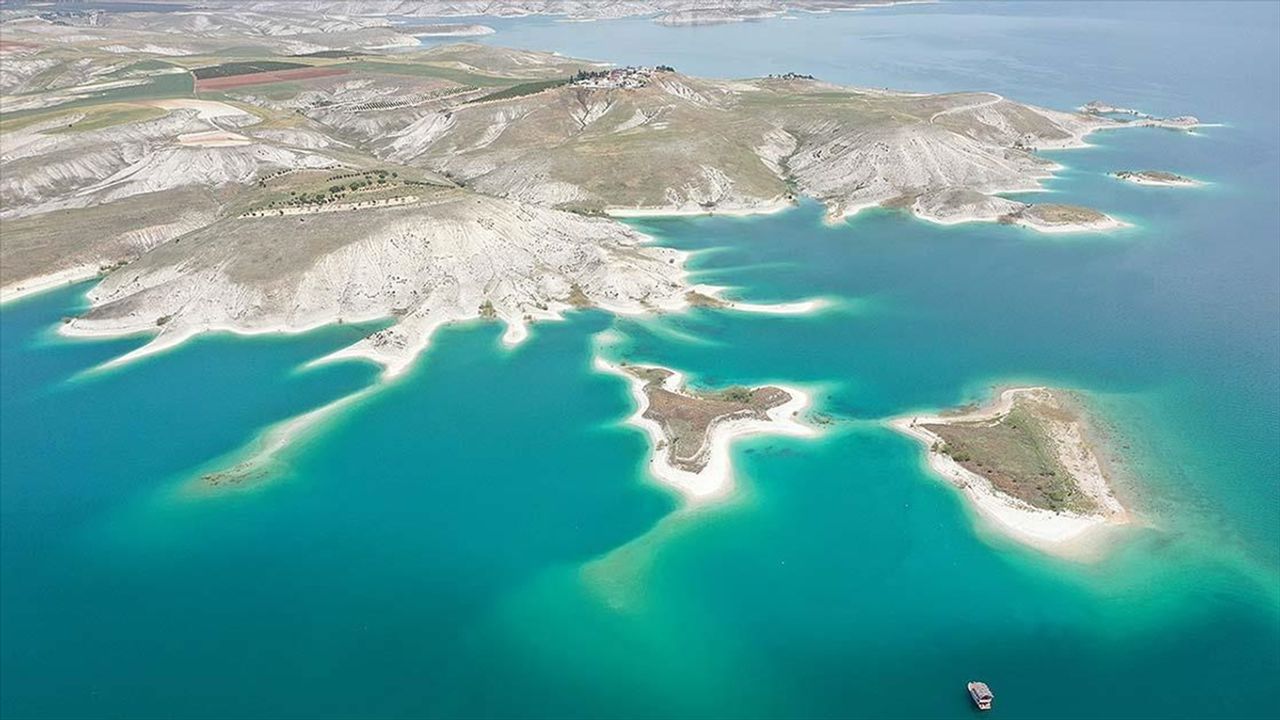 ADIYAMAN (AA) - Baraj gölü içinde bulunan yükseltiler, havaların ısınması sonucu suyun azalmasıyla adacıklara dönüşüyor.