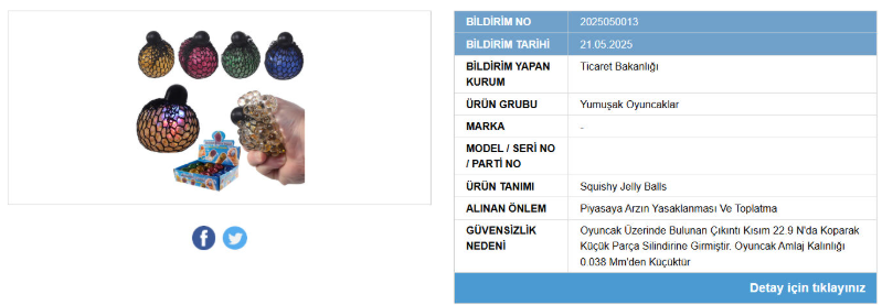 Ticaret Bakanlığı, vatandaşlara ellerinde bulunan "Squishy Jelly Balls" oyuncaklarını satıcı firmalara iade etmeleri konusunda çağrıda bulundu. Ürünler için tüketici hakları kapsamında iadeler kabul edilecek.
