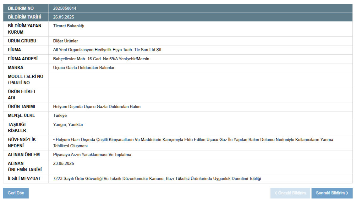 Ticaret Bakanlığı, çocuk sağlığını tehdit eden tehlikeli bir ürünü daha kamuoyuna duyurdu. Bakanlık, Mersin'in Yenişehir ilçesinde faaliyet gösteren Ali Yeni Organizasyon Hediyelik Eşya firmasına ait uçucu gazla doldurulan balonların satışını yasakladı. Bu ürünlerin helyum dışı kimyasallarla doldurulduğu ve ciddi yanma tehlikesi barındırdığı belirtildi.
