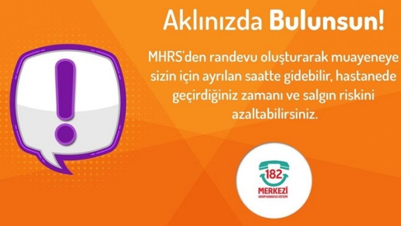 İl Sağlık Müdürlüğü yaptığı açıklamada, “MHRS'den randevu oluşturarak muayeneye sizin için ayrılan saatte gidebilir, hastanede geçirdiğiniz zamanı ve salgın riskini azaltabilirsiniz” denildi. Cuma ZEYBEK