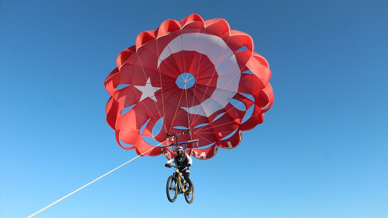 Bisikletini deniz paraşütüne bağlayan Yiğit Efe Al, bir anda gökyüzüne havalandı. Havada süzülen, bisiklet pedalı çeviren genç, akrobatik hareketler yaptı. Bir ara tekne kaptanının yönlendirmesiyle denizdeki küçük bir kara parçasına iniş yaparak tekrar havalanan Al, izleyenleri heyecanlandırdı.
