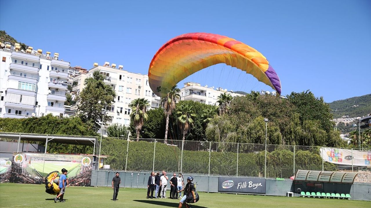 ANTALYA (AA) - Milli sporcu Harun Karateke, Yamaç Paraşütü Dünya Akro Kupası'nda elde ettiği 3'üncülük kupasını paraşütle kulüp tesislerine inerek Alanyaspor Başkanı Hasan Çavuşoğlu'na verdi.