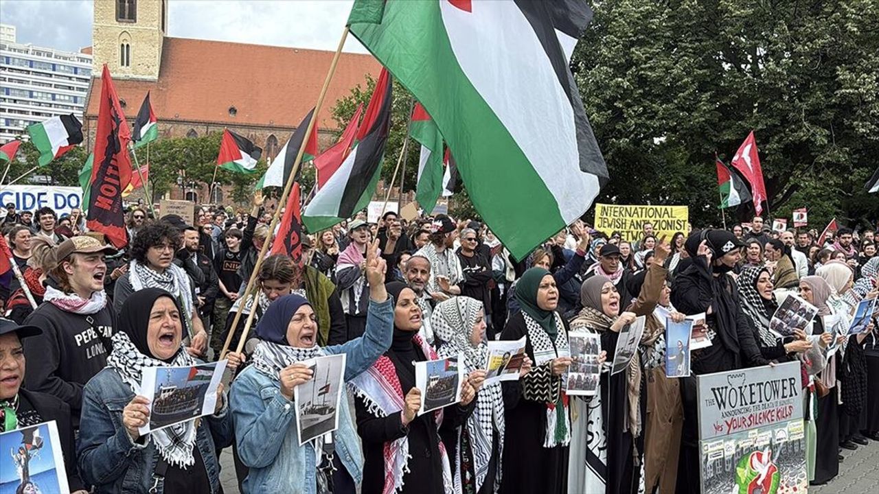 BERLIN/ANKARA/ROMA (AA) - Almanya'nın başkenti Berlin'in belediye binası önündeki Neptunbrunnen Meydanı'nda bir araya gelen yüzlerce kişi, "Madleen" gemisine yapılan saldırıyı protesto ederek, gemide alıkonulan 12 aktivistin serbest bırakılması çağrısında bulundu.