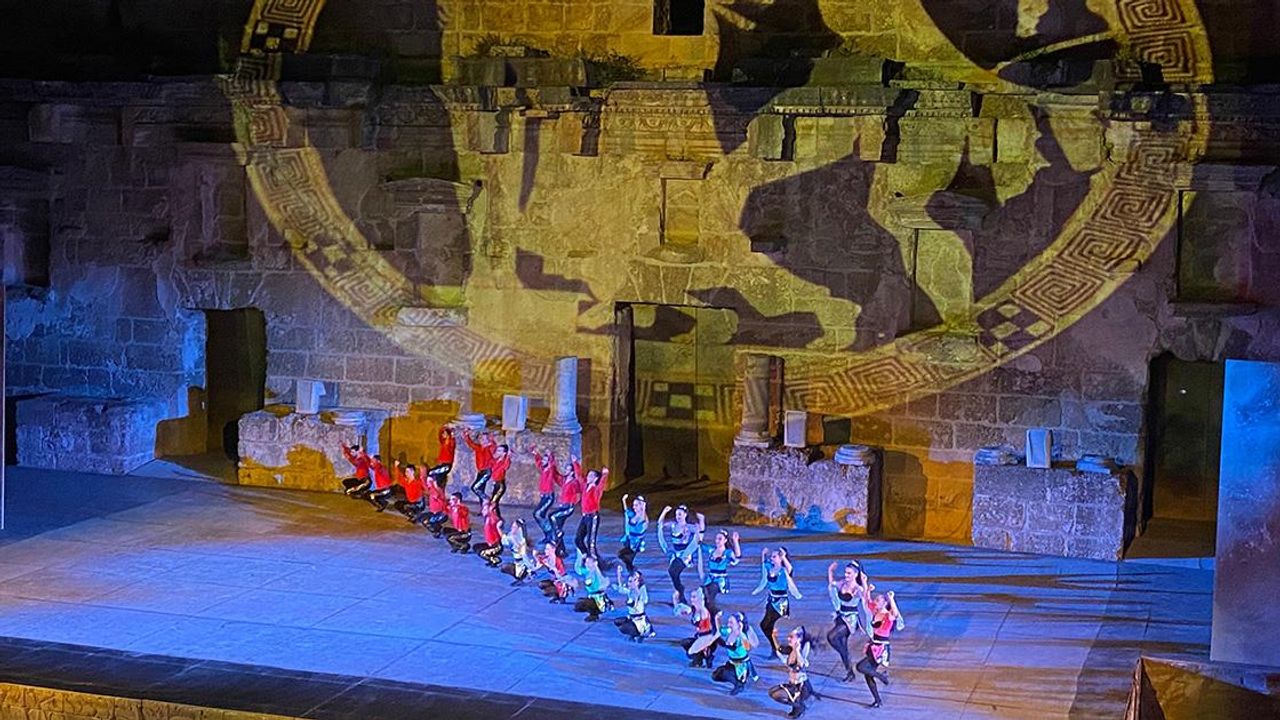 Anadolu'nun çeşitli bölgelerinden esinlenilen dansların sahnelendiği gösteride, Aspendos'un tarihi duvarlarına Türk bayrağı ve Anadolu'dan manzaralar yansıtıldı.