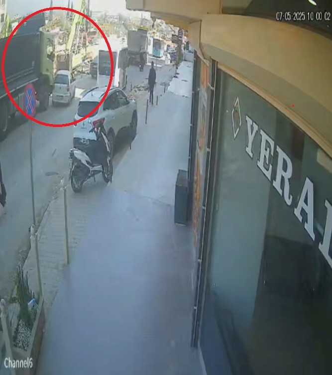 Çevredeki bir iş yerinin güvenlik kamerasına yansıyan görüntülerde, otomobilin aniden kamyonun önüne geçmesi ve kamyon tarafından kontrolsüz şekilde sürüklenmesi açıkça görülüyor.