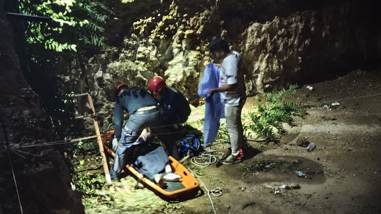 Sağlık görevlileri tarafından yapılan incelemede ayağında kırık olduğu belirlenen turist, itfaiye ekiplerince çukurdan çıkarıldı.