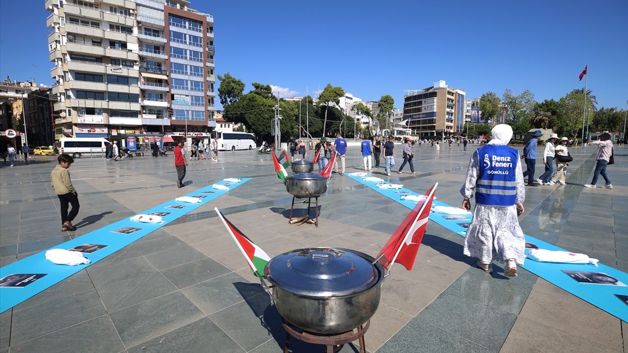 Cumhuriyet Meydanı'nda 'Gözümüzün önünde büyüyemeyenler, küçük kefenler' sloganıyla düzenlenen etkinlikte, Gazze'de bombardıman altında şehit olan çocukların fotoğraflarının, simgesel kanlı bebek kefenlerinin ve boş tencerelerin yer aldığı sergi düzenlendi.