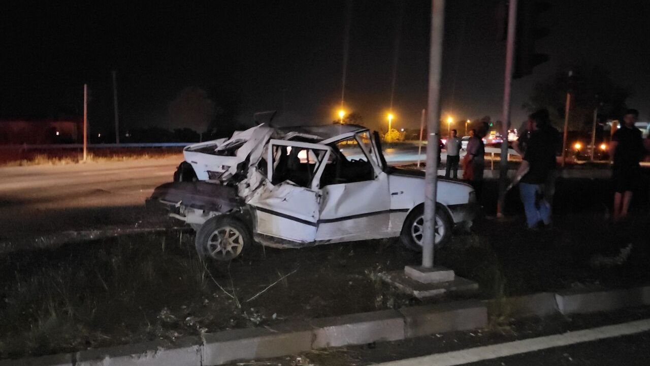 Çarpmanın etkisiyle otomobil yoldan çıkarak refüje savrulurken, kamyon ise yol kenarındaki yüksek gerilim direğine çarptı.
