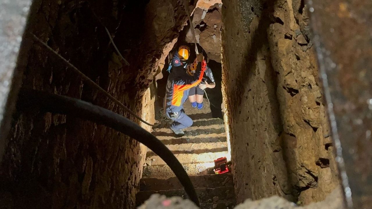 Halat yardımıyla falezlerden mağaraya inen ekipler 2 kişiyi kurtardı.