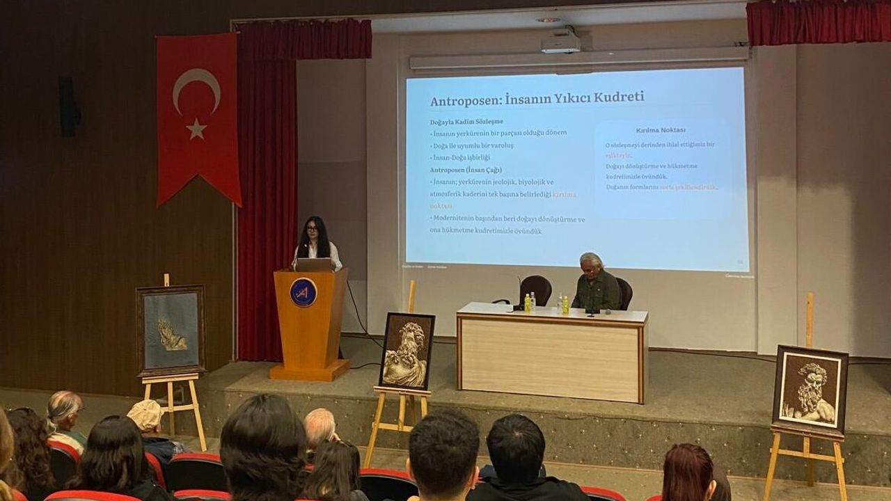 Akdeniz Üniversitesi Edebiyat Fakültesinde düzenlenen 'Antroposen Çağında Doğayla Barışmak: Doğadan Müdahalesiz Sanata' konulu söyleşide, sanatçı baba ile kızı, doğanın milyonlarca yıllık emeğini koruyan özgün sanat pratiklerini katılımcılarla paylaştı.