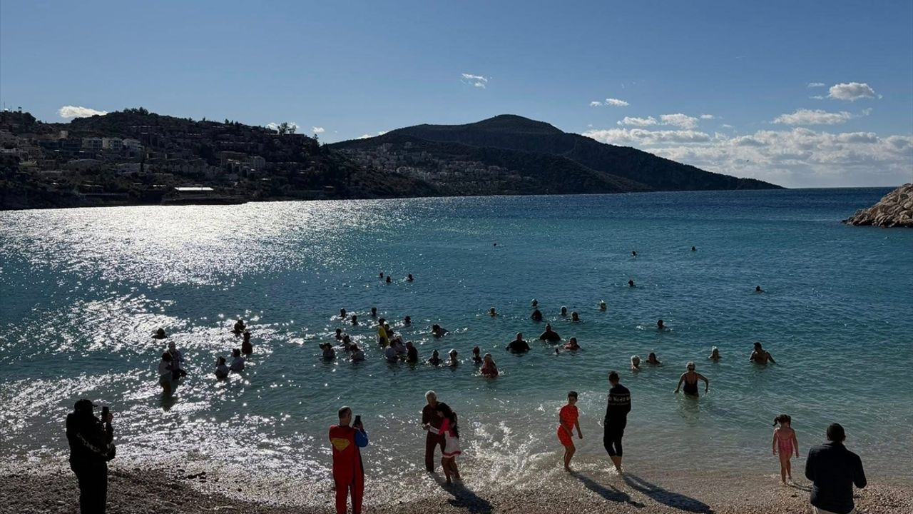 Kalkan Plajı'na giden yerleşik yabancılar, giydikleri kostümlerle denize girdi.