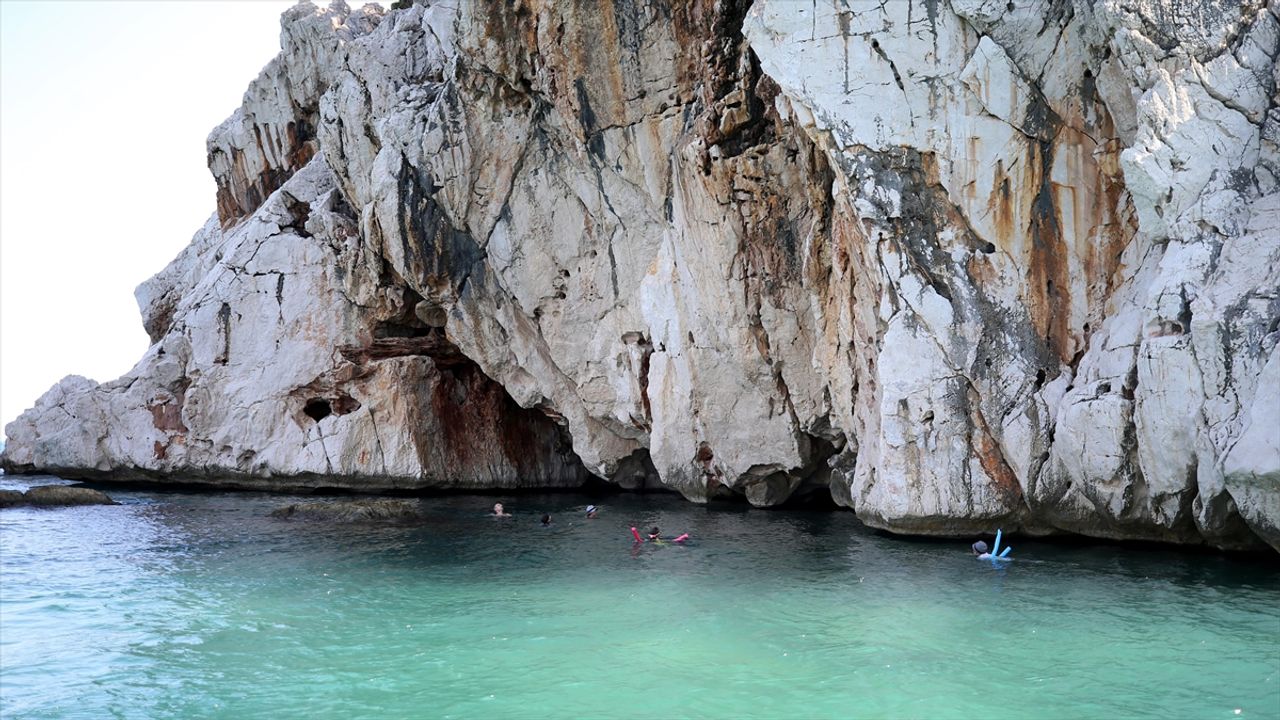 ANTALYA (AA) - Antalya'nın Konyaaltı ilçesindeki Büyük Çaltıcak Plajı'nda, turkuaz renkli suların ortasında yer alan deniz mağarası keşif meraklılarını cezbediyor.