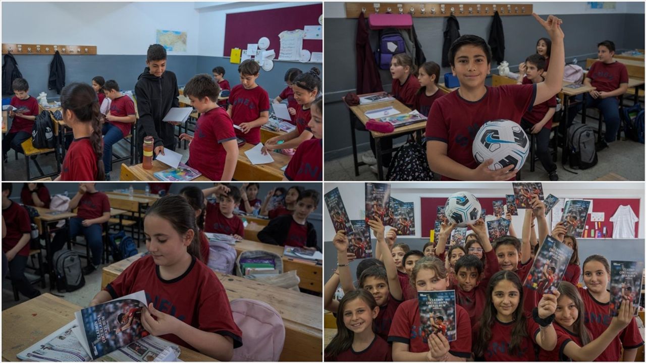Okul müdürü Mehmet Şahin ve öğretmenler tarafından mektup ve topların dağıtıldığı sırada öğrencilerin mutluluğu yüzlerine yansıdı.