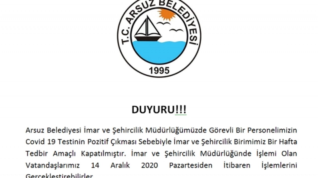 Belediyeden yapılan açıklamada, “Arsuz Belediyesi İmar ve Şehircilik Müdürlüğümüzde Görevli 3 personelimizin Kovid-19 Testinin pozitif çıkması sebebiyle imar ve şehircilik birimimiz bir hafta tedbir amaçlı kapatılmıştır. İmar ve şehircilik müdürlüğünde işlemi olan vatandaşlarımız 14 Aralık 2020 Pazartesiden itibaren işlemlerini gerçekleştirebilirler” ifadelerine yer verildi. Hasan SARP