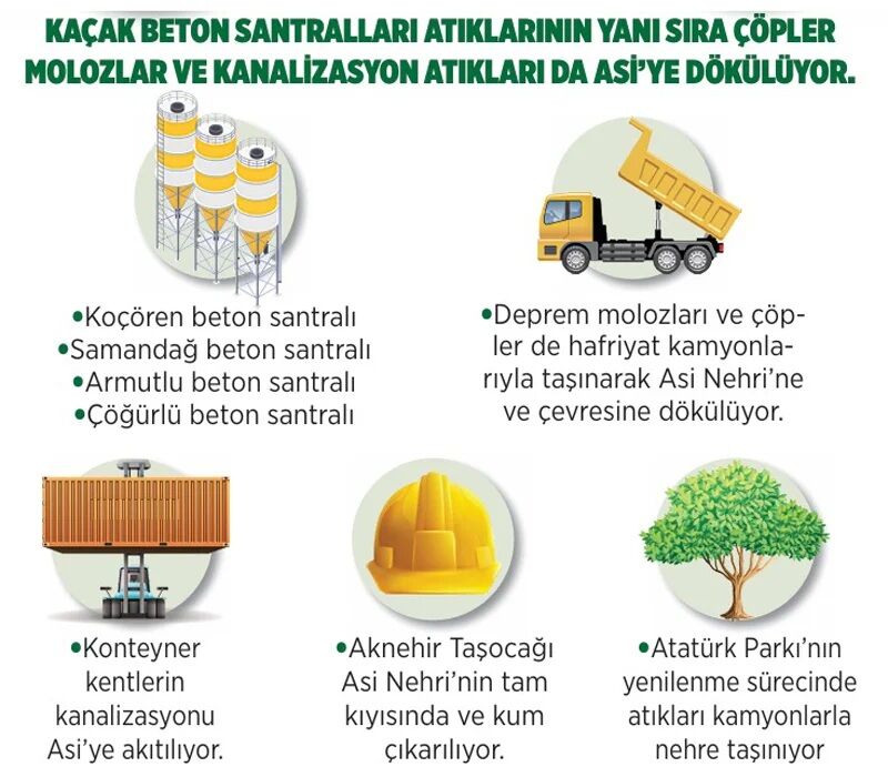 Antakya Çevre Koruma Derneği Başkanı Nilgün Karasu, Asi Nehri’ne en büyük zararın kaçak beton santralları ve taşocaklarından geldiğini vurguladı. Karasu, “Deprem öncesi büyük bir kirlilik vardı, şimdi daha da arttı. Kanalizasyon atıkları ve sanayi pislikleri doğrudan nehre boşaltılıyor,” dedi.