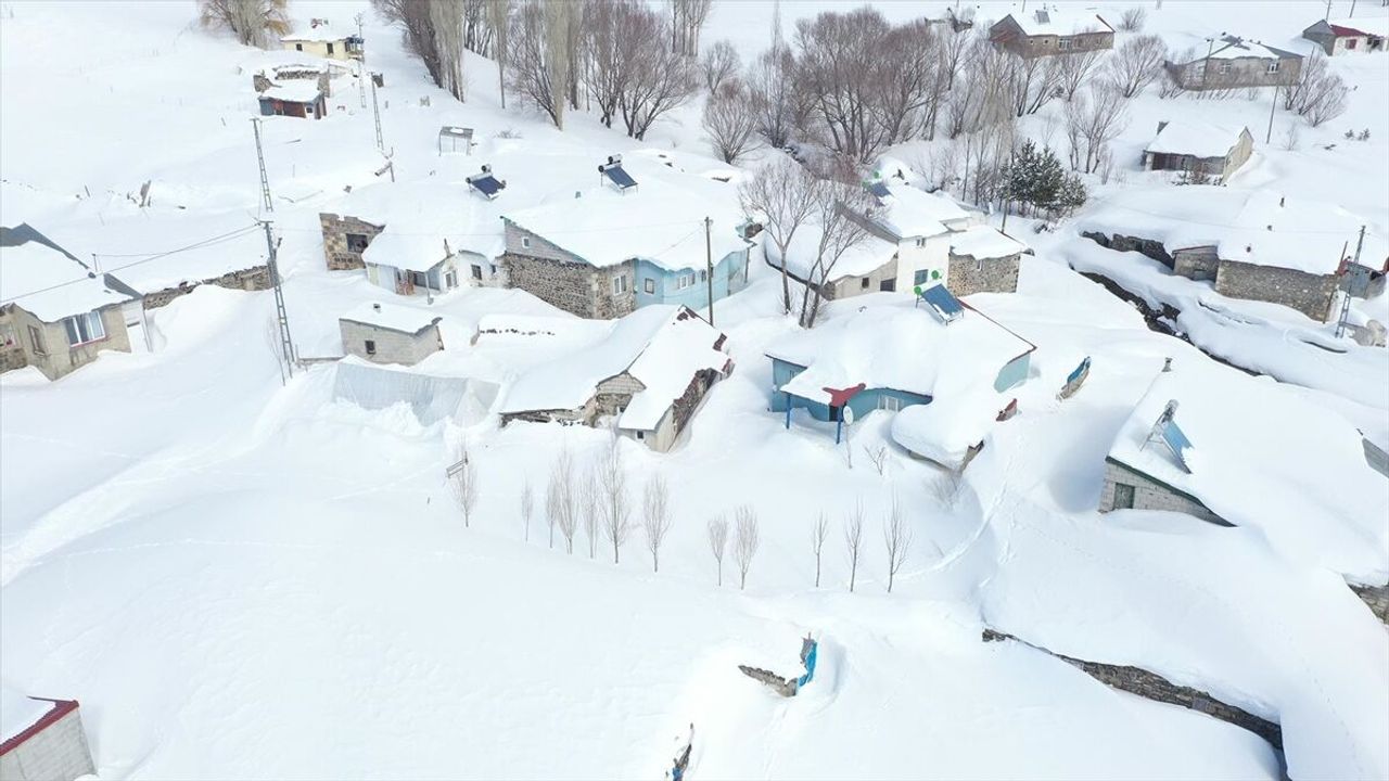 Baharda kışın yaşandığı, ev ve ahırların kardan kaybolduğu köyler, AA ekibince dronla görüntülendi.