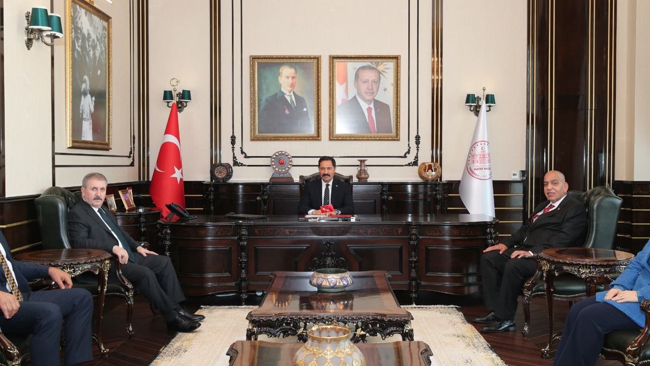 HATAY (AA) - Büyük Birlik Partisi (BBP) Genel Başkanı Mustafa Destici, Hatay Valiliği, İl Emniyet Müdürlüğü ile Reyhanlı Ticaret ve Sanayi Odasını ziyaret etti, Habib-i Neccar Camisi'ni inceledi.