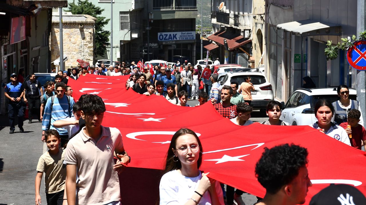 Kaymakam Mahmut Sami Yılmaz ve diğer protokol üyeleri öğrencilerle ellerinde Türk bayrakları ve marşlar söyleyerek Atatürk Anıtı'na kadar yürüdü.
