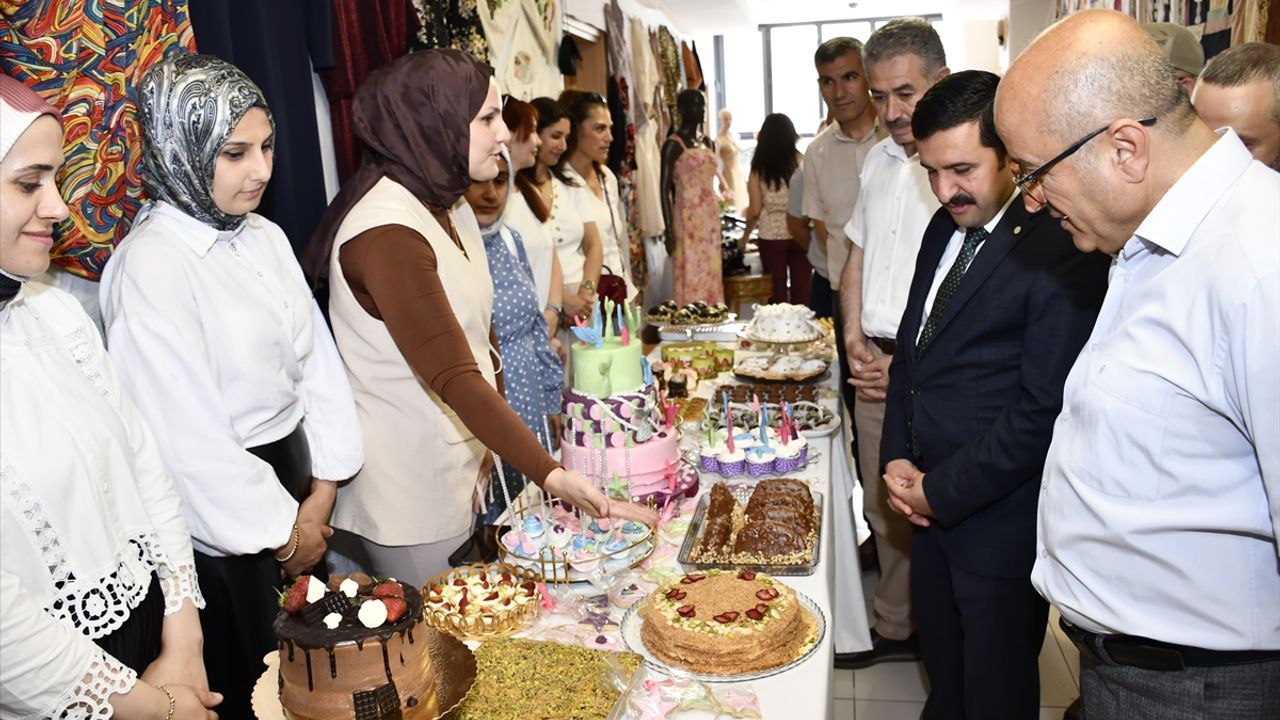 Yılmaz ve ziyaretçiler, el sanatları kurslarında hazırlanan ürünlerin yer aldığı stantları gezdi.
