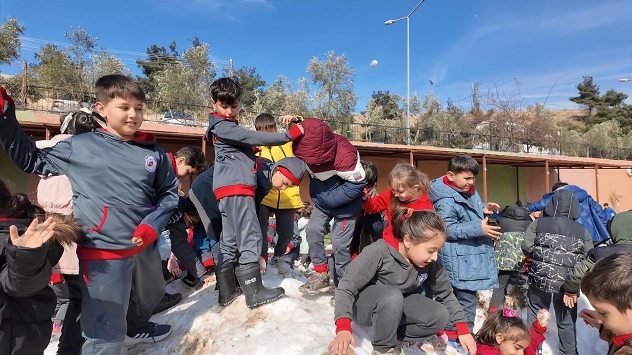 Öğretmenleriyle okul bahçesinde kar topu oynayarak doyasıya eğlenen çocuklar Belediye Başkanı Gül'e teşekkür etti.