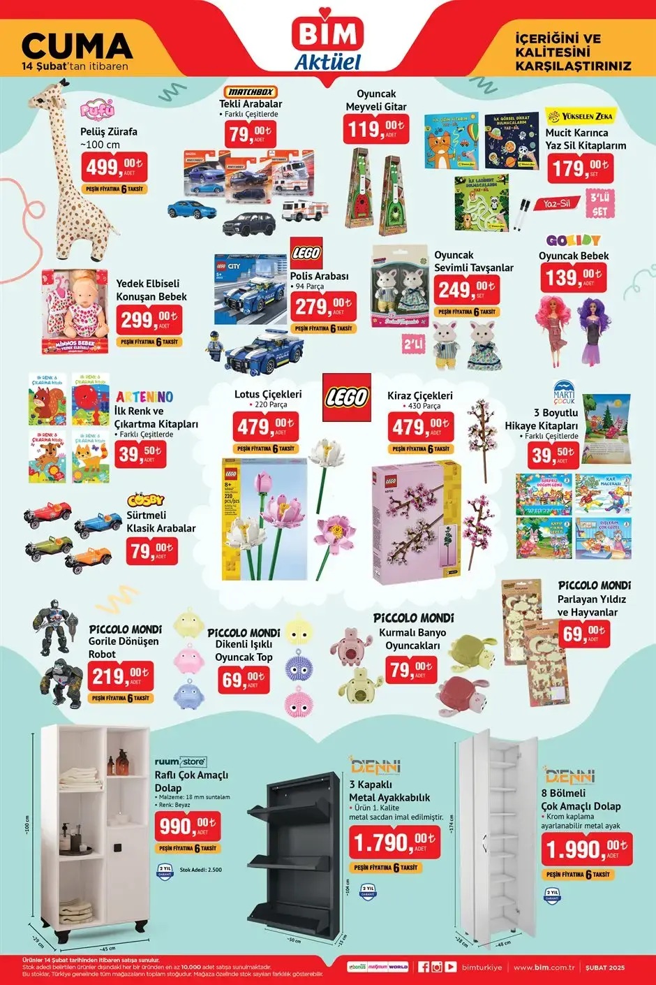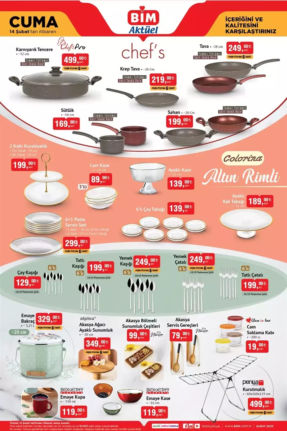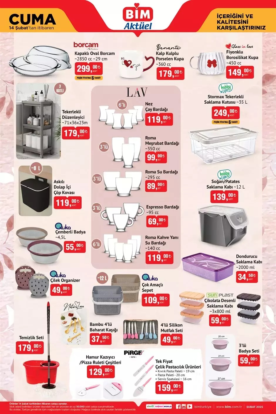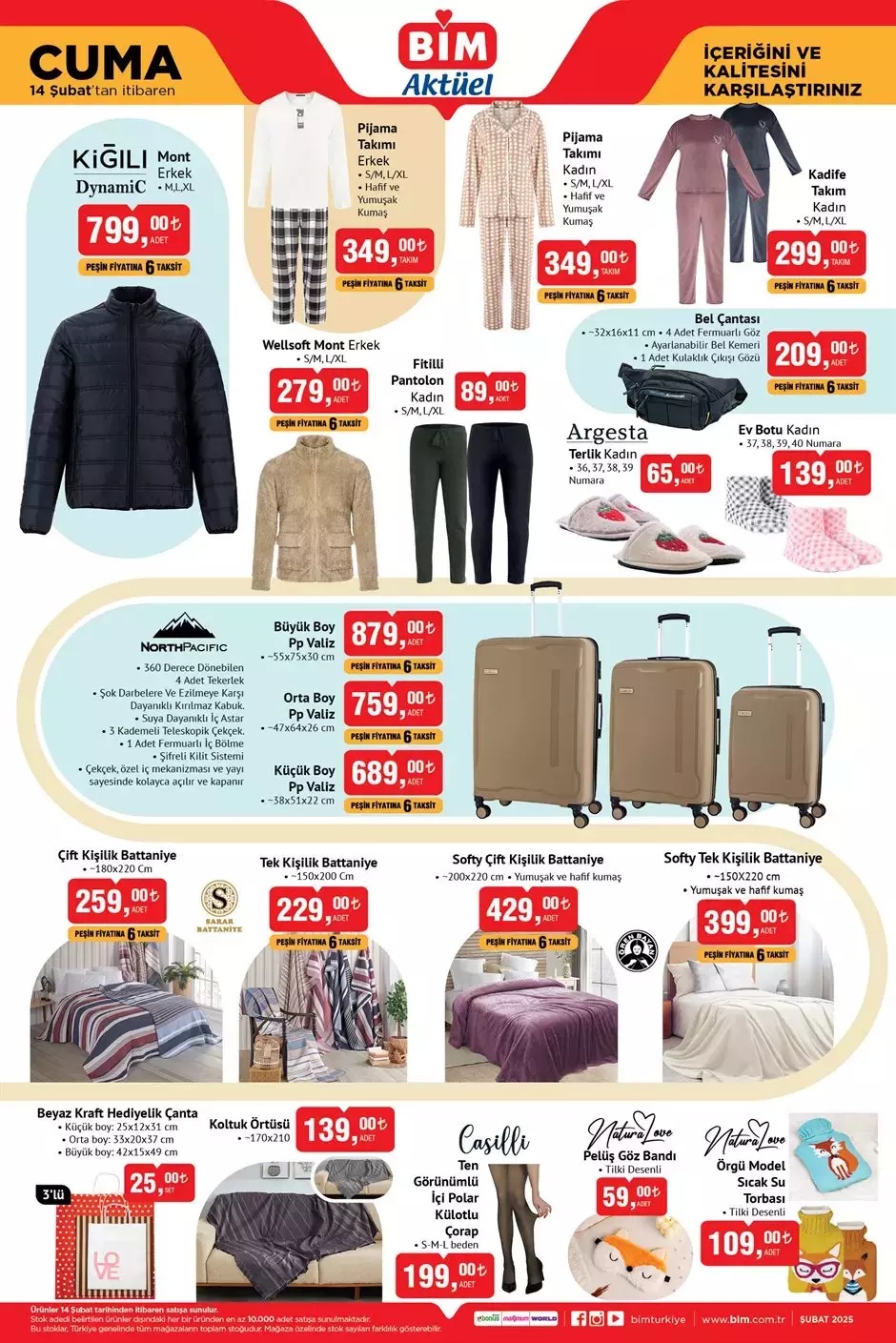 Her hafta farklı ürün seçeneklerinin yer aldığı BİM aktüel kataloğunda bu hafta Cuma günü Valiz Çeşitleri, Kiğılı Mont, Pijama Takımı, Borcam, Porselen Kupa, Tekerlekli Düzenleyici, Karnıyarık Tencere, 2 Katlı Kurabiyelik, Emaye Bakraç ve daha birçok ürün yer alıyor. İşte BİM 14 Şubat Cuma kataloğunda yer alan ürünlerin tam ve eksiksiz listesi...