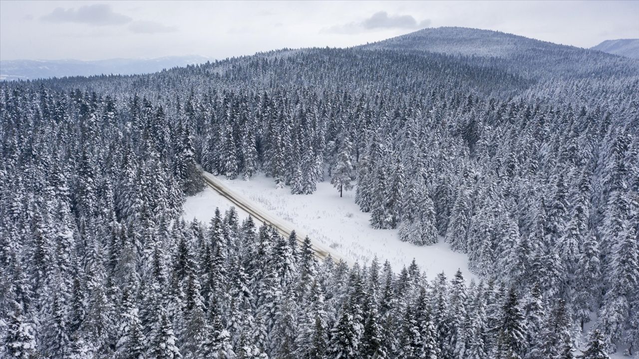 Öte yandan bölgede kar yağışı ve karla kaplı çam ağaçları havadan görüntülendi.