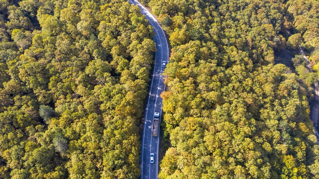 Tabiat parkına ulaşımı sağlayan kara yolunda, yeşil, sarı ve kahverenginin tonlarına bürünen ağaçlar güzel manzara oluşturuyor.