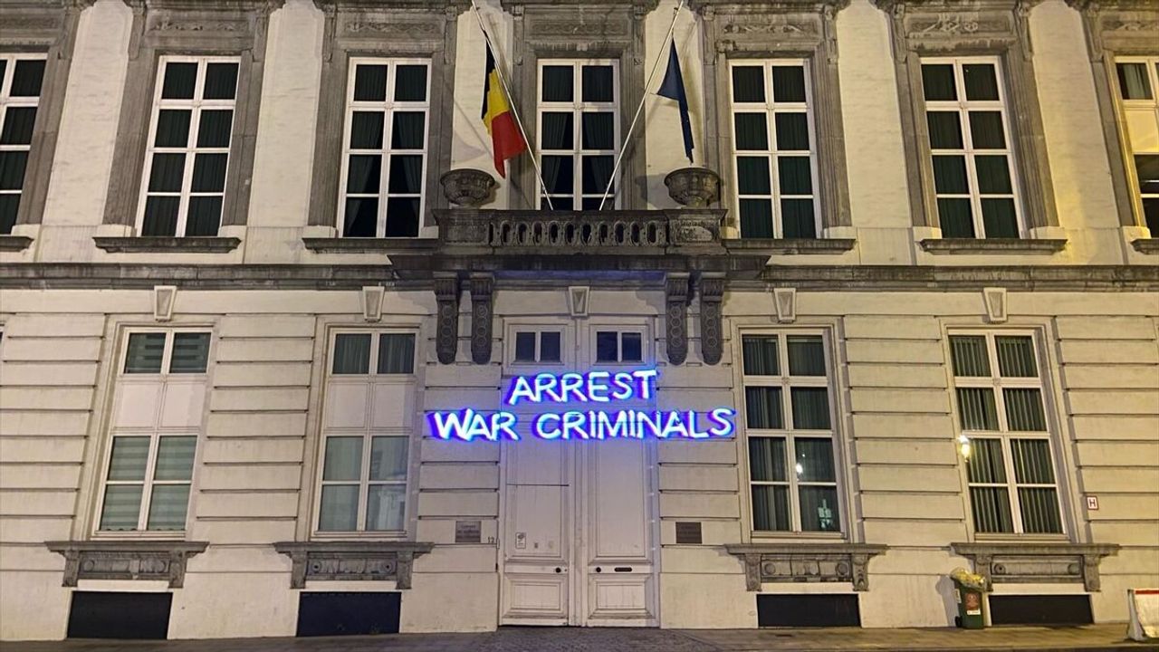Aktivistlerin, Brüksel'deki federal hükümet binasına "Savaş suçlularını tutuklayın" yazısı yansıttığı belirtilen açıklamada, şunlar kaydedildi:
