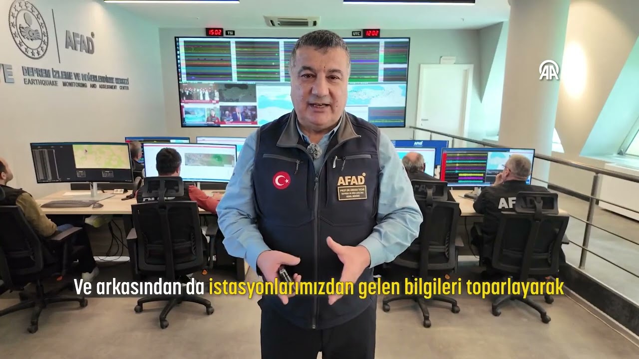 "Herhangi bir yerde deprem meydana geldiğinde arkada gördüğünüz haritada bu depremi kaydeden istasyonlar uyarı vermektedir. Otomatik çözüm yapan programımız birkaç saniye içinde depremin merkez üssü ile ilgili bize ön bilgi vermektedir. Ancak otomatik çözüm de hata payı olabileceğinden bu ilk veriyi kamuoyuyla paylaşmamaktayız. Bunun yerine yaklaşık 5-7 dakika içerisinde manuel çözümleme yaparak depreme ait kesin bilgileri sosyal medya hesaplarımız ve web sayfamız aracılığıyla kamuoyuyla paylaşmaktayız. Deprem çözümlemesi yapan sismoloji merkezlerinin depreme ait farklı bilgiler vermesi zaman zaman kamuoyunda tartışılsa da aslında olağan bir durumdur."