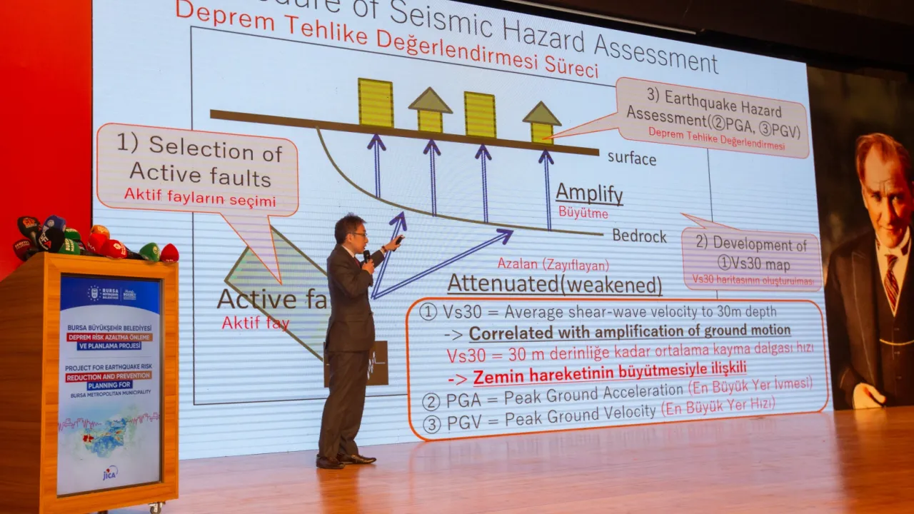 Bursa Büyükşehir Belediyesi’nin Japonya Uluslararası İşbirliği Ajansı (JICA) ile birlikte yürüttüğü ‘Deprem Risk Azaltma ve Önleme Planlama Projesi’nin ilk çıktıları olan ‘Deprem tehlike değerlendirmesi', 'Bina risk değerlendirmesi', 'Altyapı ve kamu bina risk değerlendirmesi' sonuçları kamuoyuyla paylaşıldı. JICA Türkiye Ofisi Kıdemli Temsilcisi Susaku Kawa, birçok risk ve zorluk tespit edildiğini açıkladı.BURSA (İGFA) - Birinci derece deprem kuşağında yer alan Bursa'nın dirençli ve sürdürülebilir bir kent olması adına çalışmalarını sürdüren Büyükşehir Belediyesi, JICA ile yürüttüğü ‘Deprem Risk Azaltma ve Önleme Planlaması Projesi’ni tüm hızıyla sürdürüyor.
