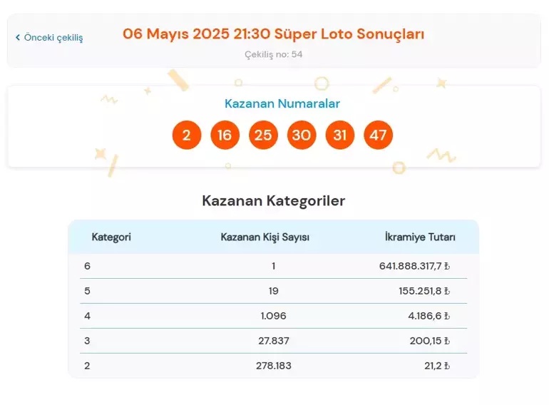 6 Mayıs 2025 Salı Süper Loto kazandıran numaraları: