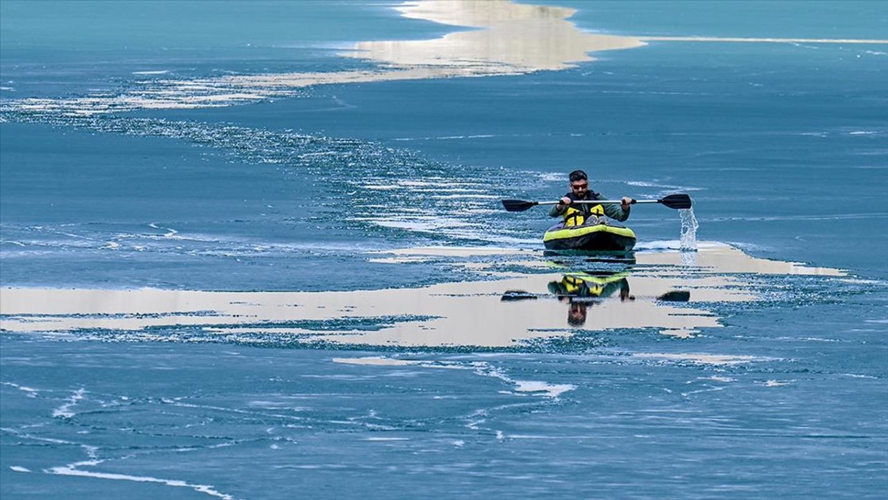Havanın ısınmasıyla yüzeyindeki buz tabakası çözülmeye başlayan baraj gölü, sporseverleri ağırladı.