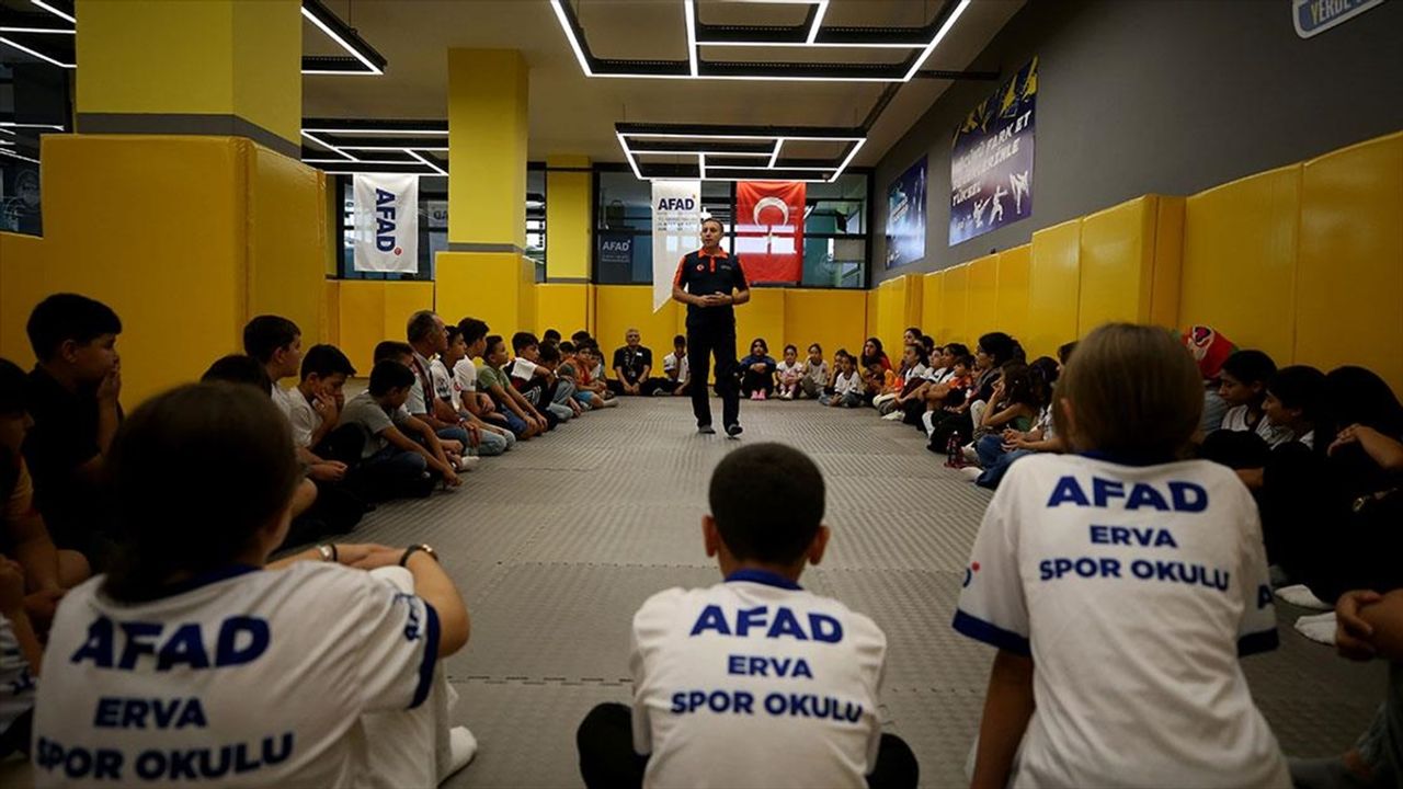 AFAD ERVA Spor Kulübüne gelen yaklaşık 200 çocuk, iki antrenör eşliğinde kick boks, muaythai ve karate dersleri alırken AFAD görevlilerinden de afetlerde nasıl önlem alacaklarını ve sonrasında neler yapacaklarını öğreniyor.