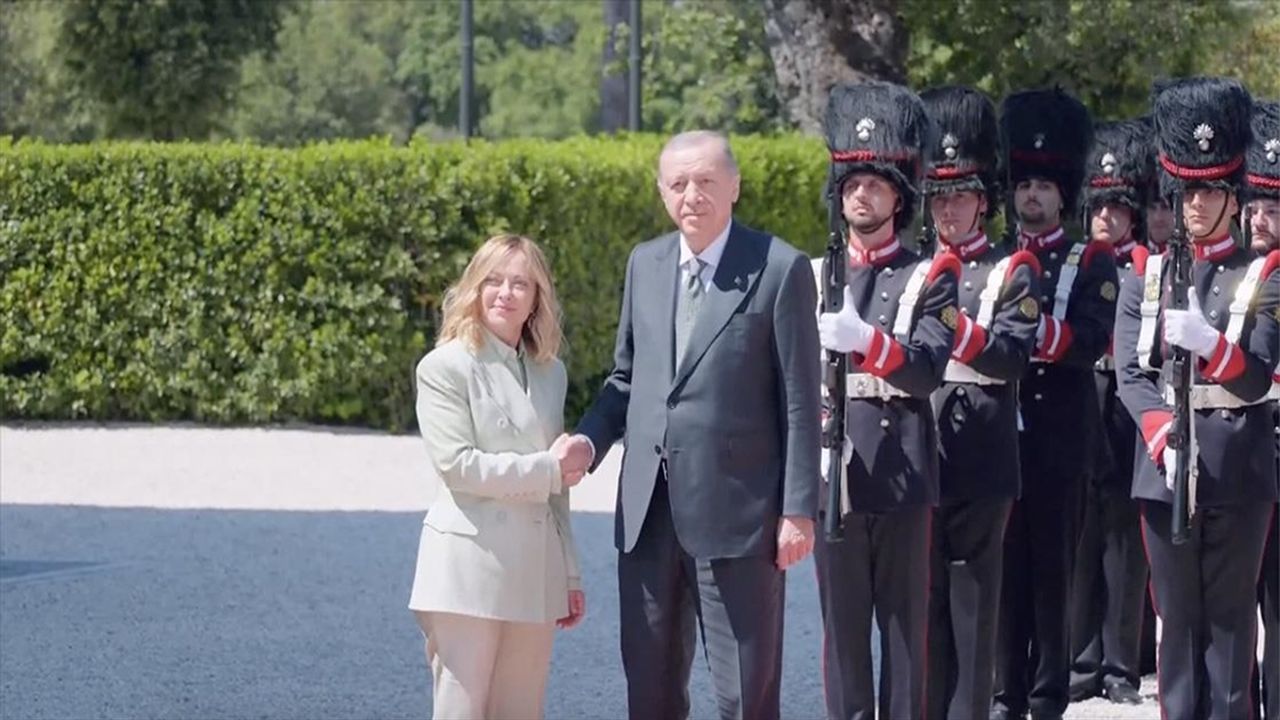 ROMA (AA) - Başbakan Meloni, Villa Pamphili Konutu'nda düzenlenen törende, Cumhurbaşkanı Erdoğan'ı aracından inerken karşıladı.