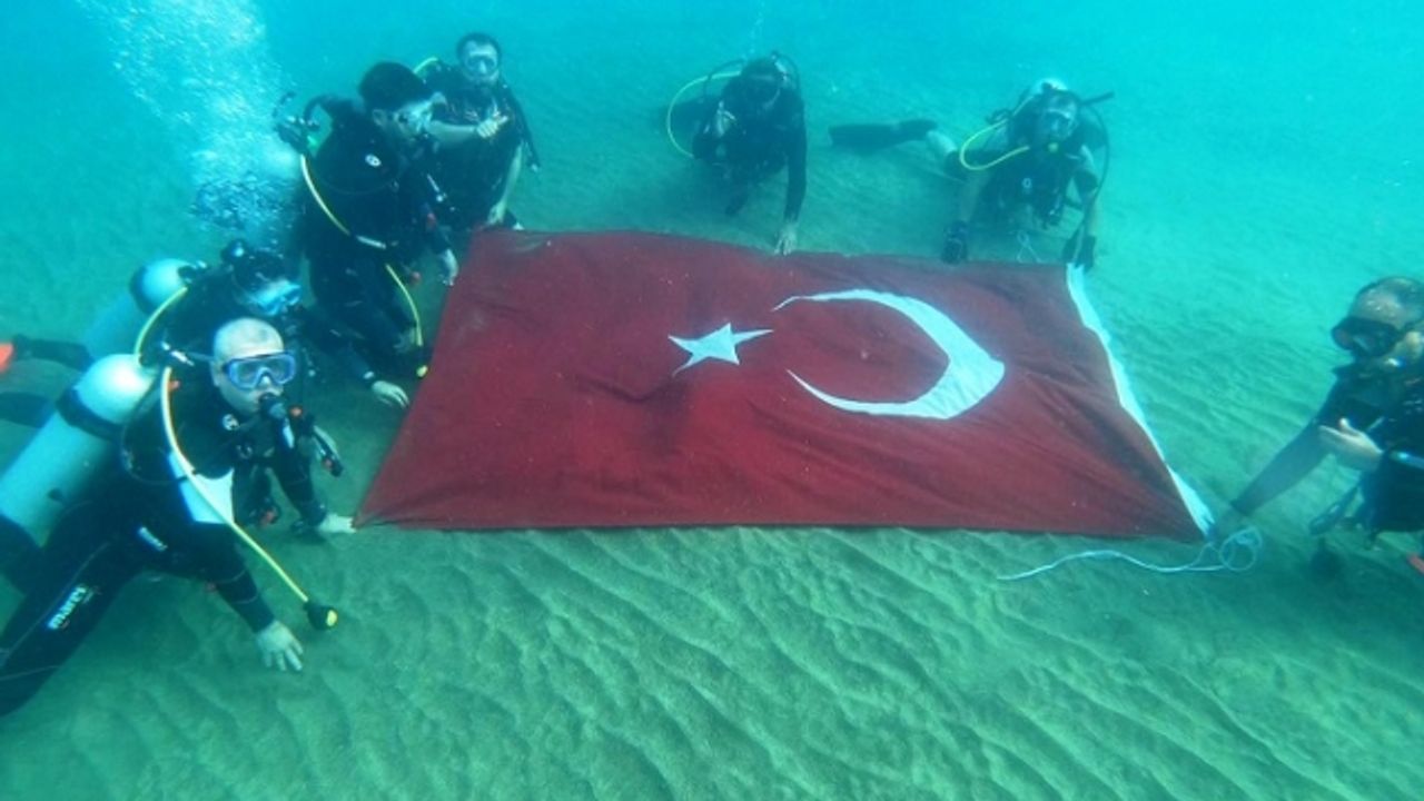 Dalgıçlar, su altında Türk bayrağı ve üzerinde "El ele hep birlikte, dünyanın dört bir yanına barış ve huzur götüren Mehmetçiğe selam olsun" yazısı bulunan pankart açtı.