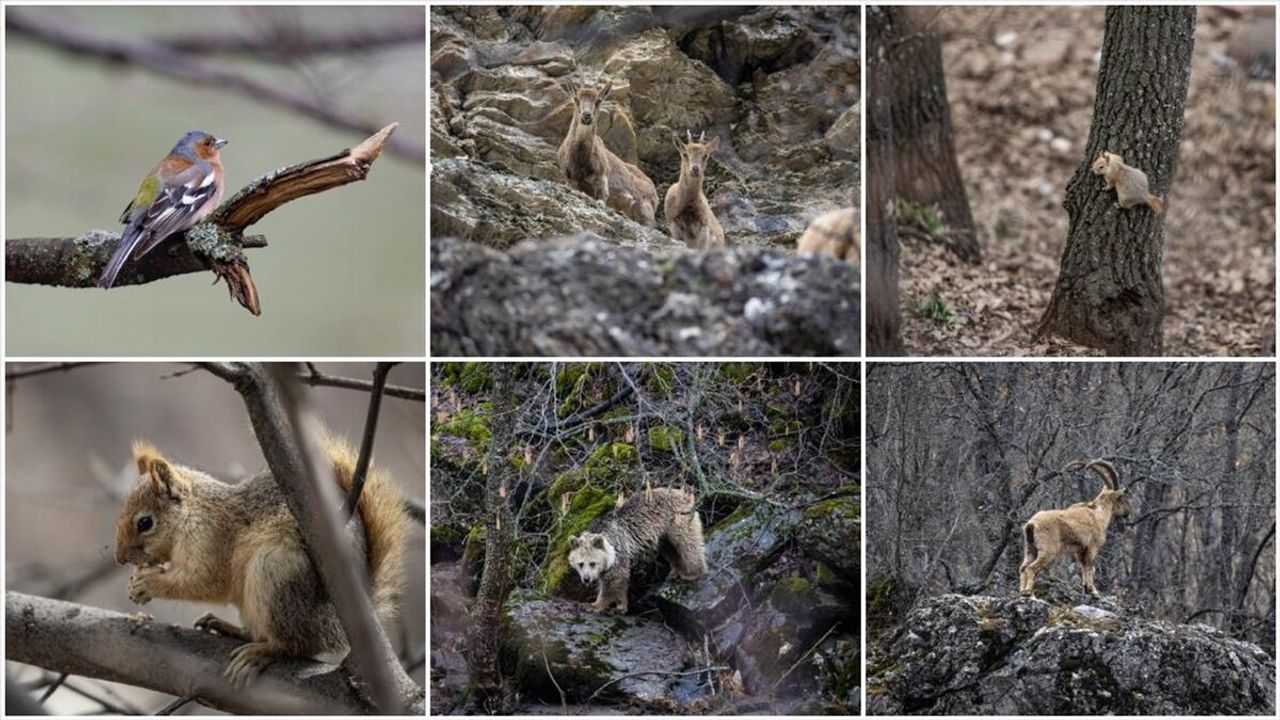 Güvenli buldukları noktaları mesken tutan yaban keçileri ve kış uykusundan uyanan bozayılar, meşe ormanlarıyla kaplı dağlarda yiyecek ararken görüntülendi.