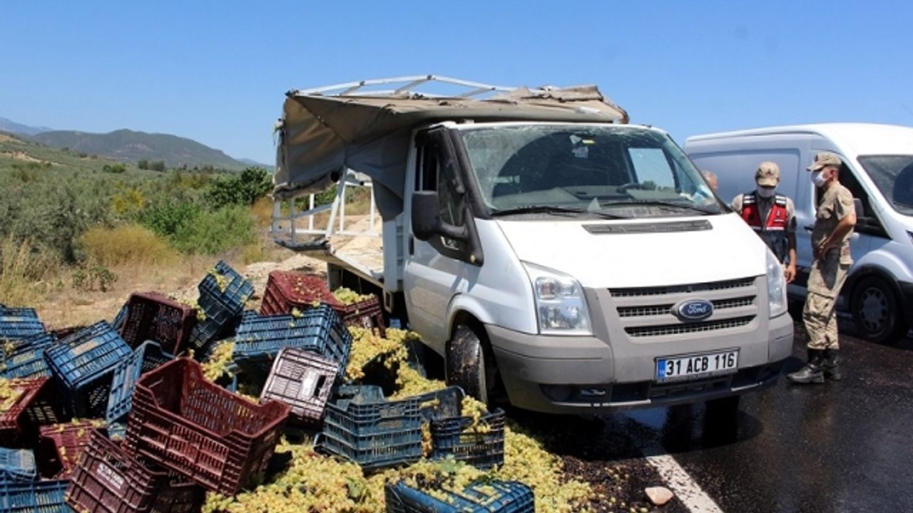 Hassa ilçesinde devrilen kamyonetteki yaklaşık 2 ton üzüm yola saçıldı, kaza nedeniyle ulaşım aksadı.