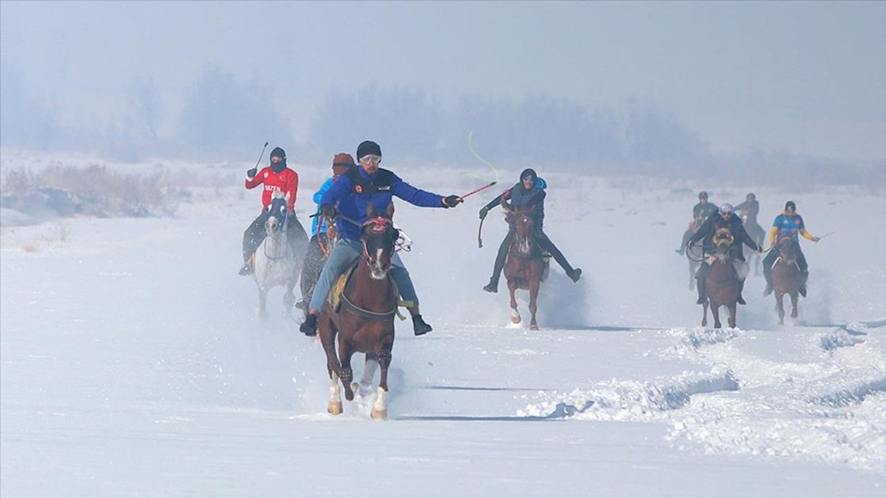 Atlar, kar üstünde bin 800 metrelik parkuru ilk sırada tamamlamak için kıyasıya mücadele etti.