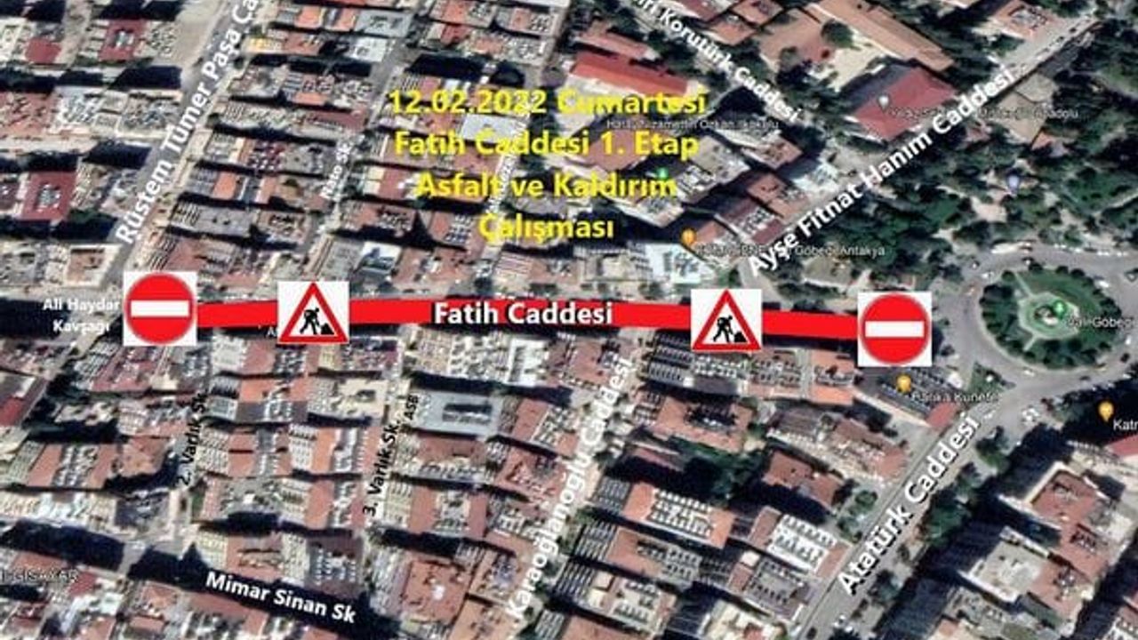 Gerçekleştirilen duyuruda Antakya ilçesine bağlı Fatih Caddesi'nin ( Vali Ürgen Alanı ile Ali Haydar Kavşağı arası) 1. etap asfalt ve kaldırım yenileme çalışmaları nedeniyle bu gün trafiğe kapatılacağı bildirildi. Cuma ZEYBEK