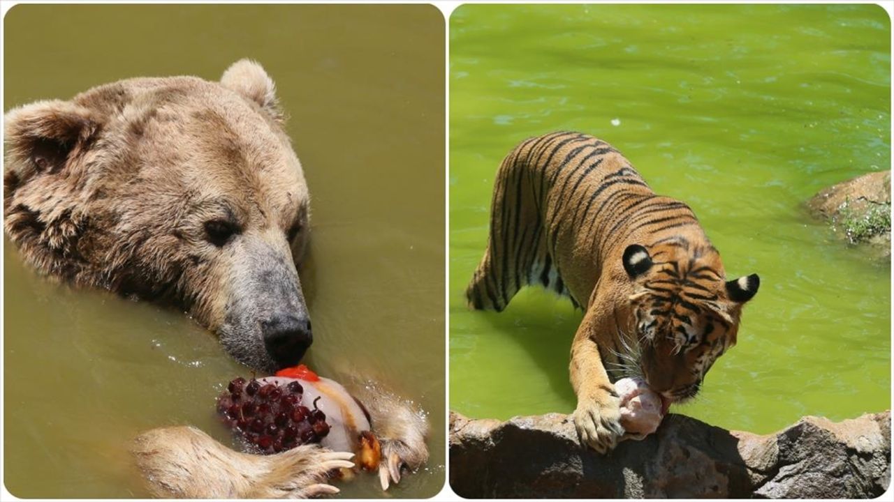 Kaplan ve aslan gibi yırtıcı hayvanlara buzlu et kokteyli, ayılara ise elma, portakal, kivi, çilek, muz ve üzümden oluşan meyveli buz kokteylleri veriliyor.
