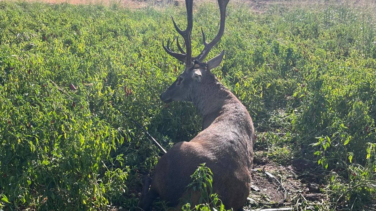 Çiftçi Mustafa Öztürk, kırsal Çubuk Mahallesi civarında biber tarlasındaki ürünlerini kontrol ederken, sulama hortumlarına dolanıp bitkin düşen, koruma altındaki erkek yaban geyiğini fark etti.