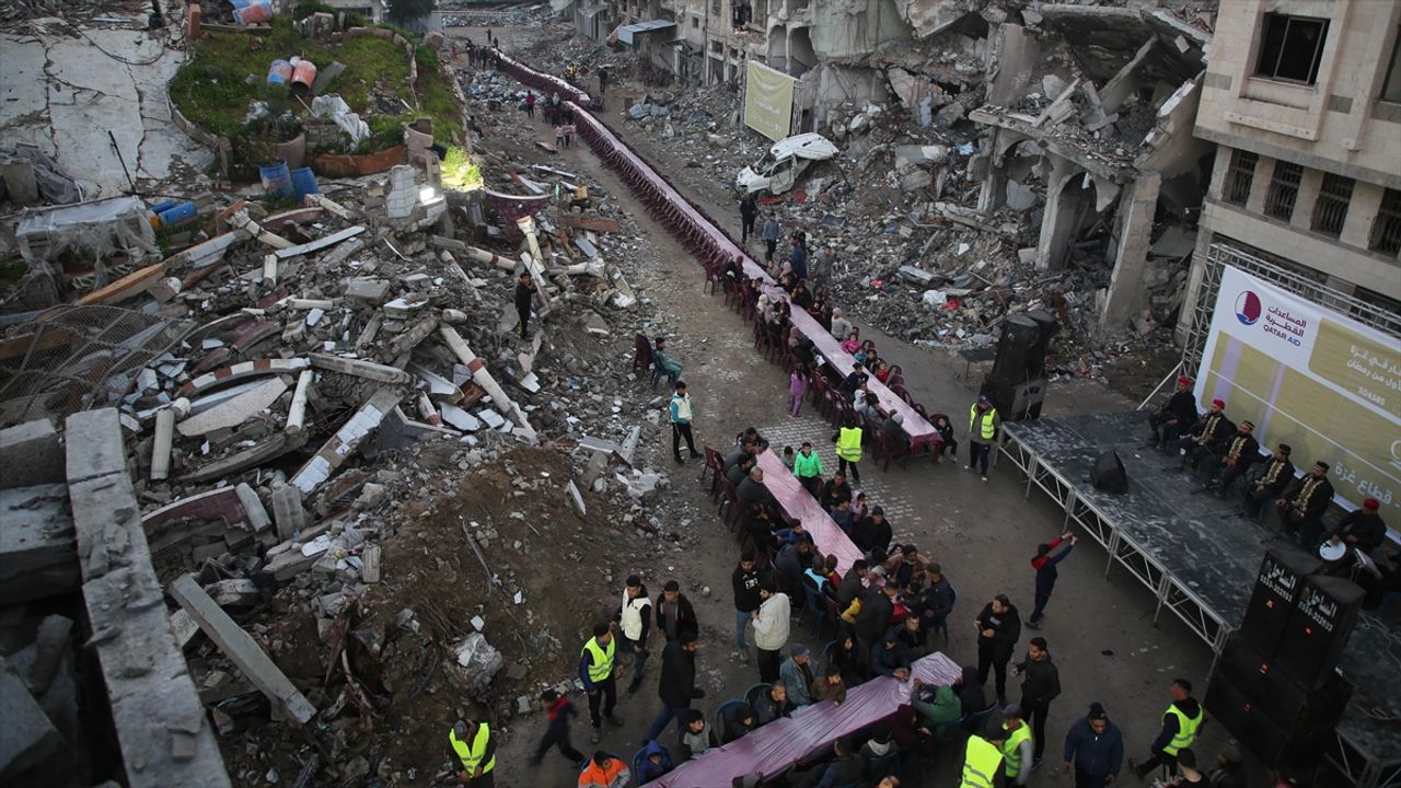 GAZZE (AA) - İsrail saldırılarıyla büyük yıkıma uğrayan Gazze Şeridi'nin kuzeyinde ramazanın ilk iftarı, enkaz yığınları arasında kurulan sofrada toplu olarak yapıldı.