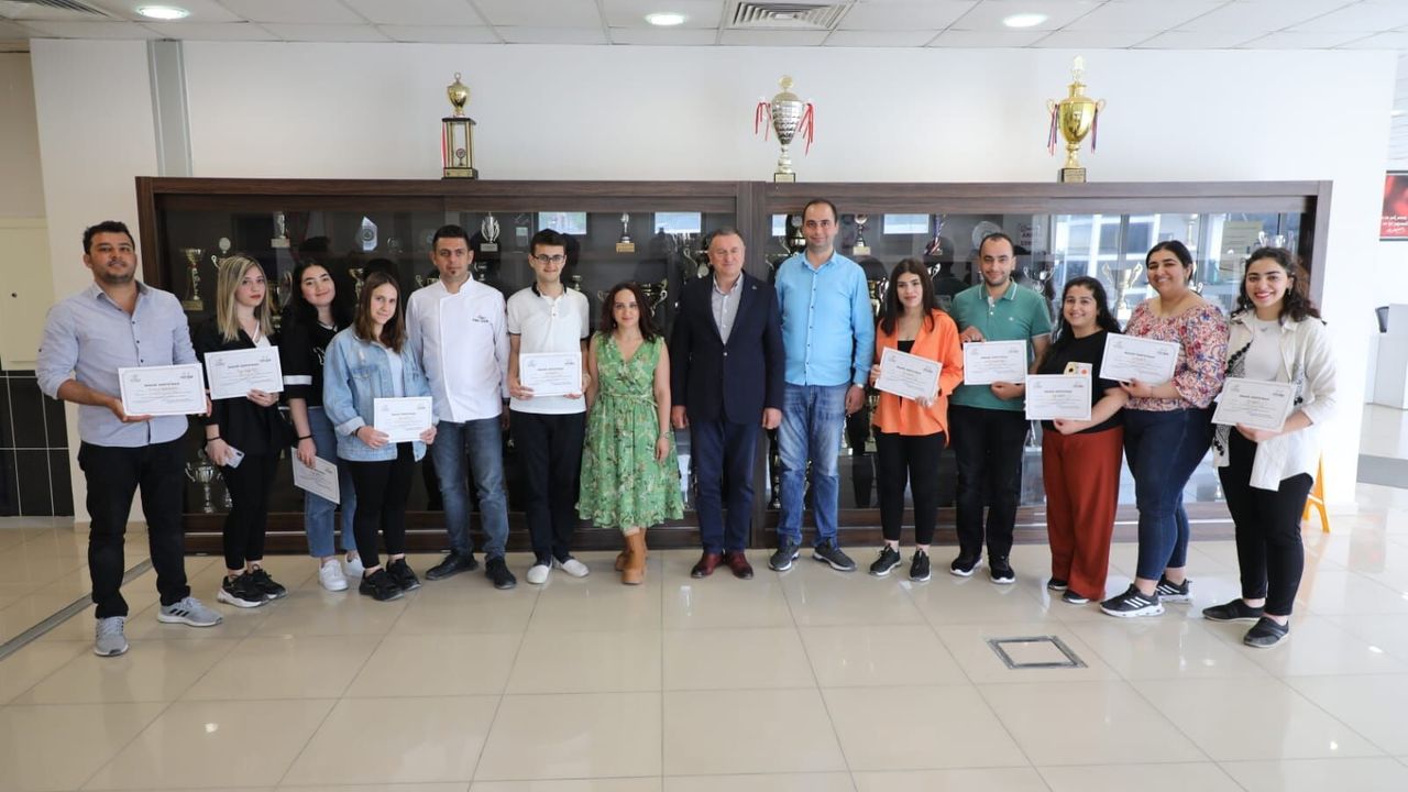 UNESCO Hatay Gastronomi Evi’nde yaklaşık 3 ay süren eğitimde Hatay mutfağının lezzetlerini teorik ve pratik olarak öğrenen şef adayları, başarı belgelerini Başkan Savaş’ın elinden aldı.