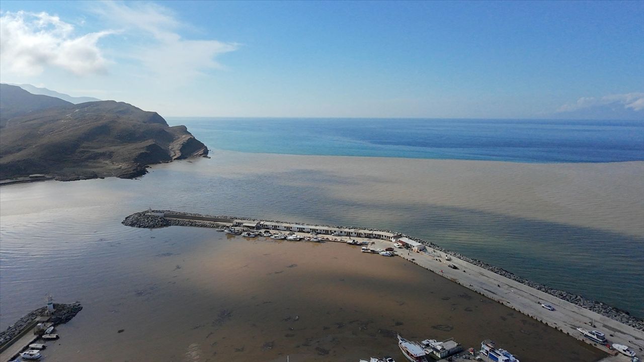 Çamurlu suyun aktığı Kaleköy Limanı kahverengi renge bürünürken dağlardan gelen malzemeler de teknelerin bağlı bulunduğu alana yayıldı.