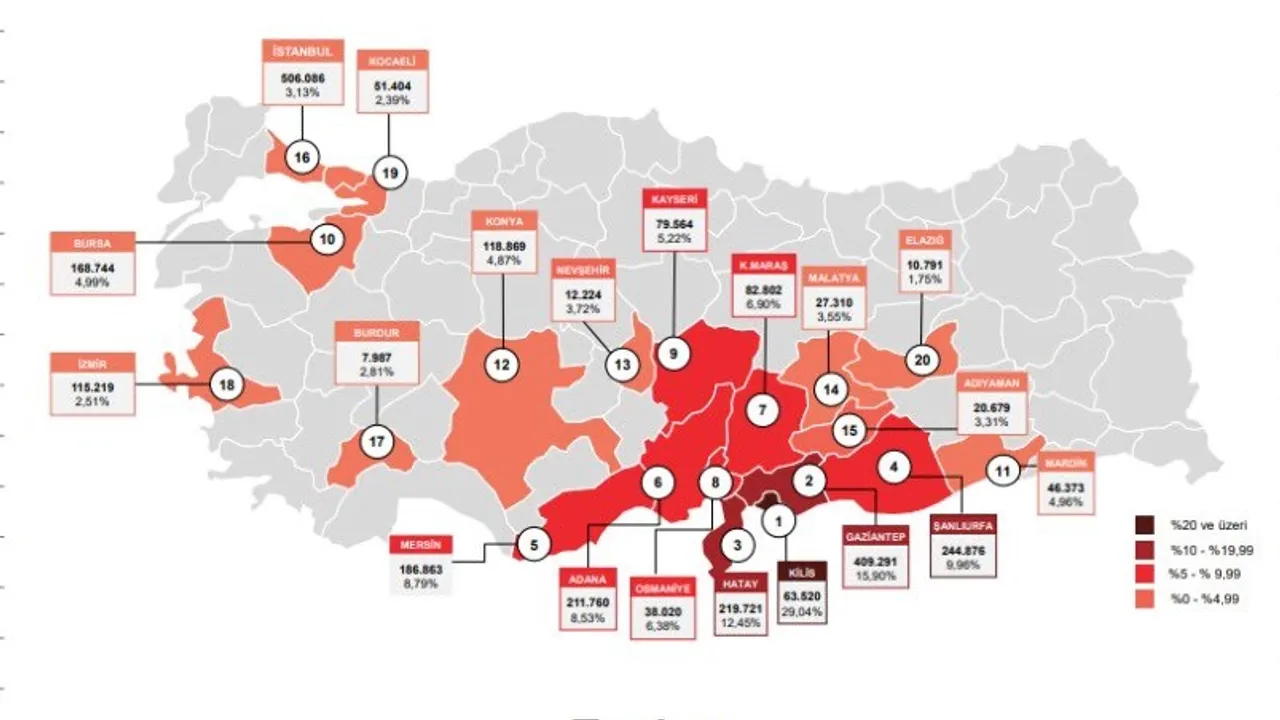 Türkiye'de geçici koruma altında bulunan Suriyelilerin geldikleri bölgeleri ve sayılarıda tek tek açıklayan Göç İdaresi Başkanlığı; Halep'ten 1 milyon 239 bin 845, İdlip'ten 187 bin 498, Deyrizor'dan 106 bin 192, Hama'dan 102 bin 758, Haseke'den 96 bin 502'nin geldiğini anımsattı.