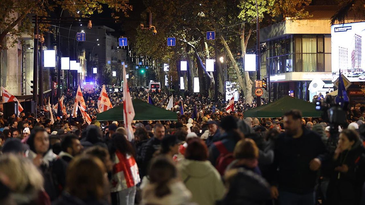Ellerinde Gürcistan ile AB bayraklarını taşıyan göstericiler, seçimlerin yeniden yapılmasını talep ederek hükümet karşıtı sloganlar attı.