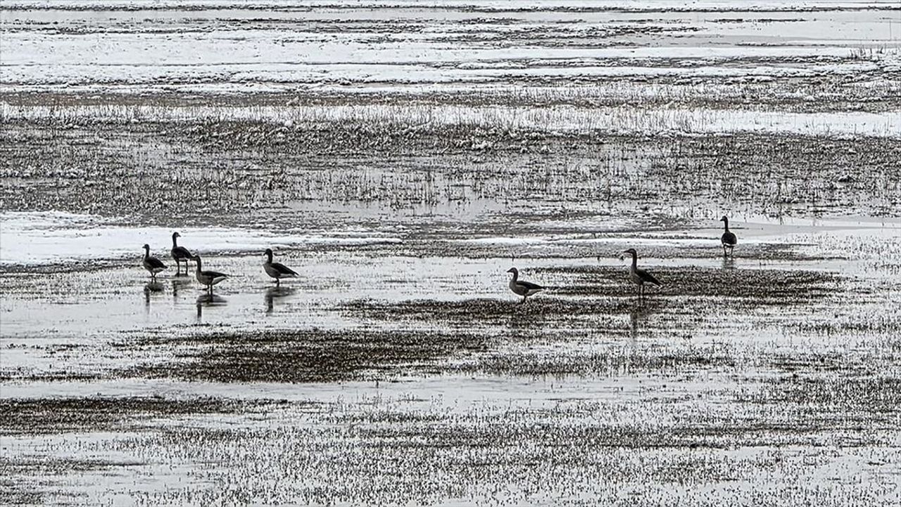 Gölde konaklayan ve zorlu kış şartlarında yiyecek bulmaya çalışan turna, yaban kazı ve yaban ördeklerinin beyaz örtüde yiyecek arayışı objektiflere yansıdı.